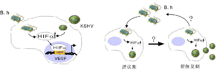 方向三:病毒共感染致瘤机制及其肿瘤诊治靶标和策略 卡波氏肉瘤病毒与巴尔通体介导血管生成的机制差异及相关性: 感染性疾病的发生是病原体与宿主细胞相互斗争的结果,单一病原体如病毒或细菌很少能够引发疾病,往往是多种病原体共感染所造成的。KSHV与汉赛巴尔通体作为一种典型的肿瘤病毒和细菌均能促进皮肤性血管增生,并分别造成卡波氏肉瘤(KS)与杆菌性血管瘤(BA),而KS与BA临床症状与病理变化极为相似,临床上难以区分。加之临床上缺乏对该类疾病的认识与了解,该类疾病尚未被列入医院常规检测的项目,因此极易造成误诊与漏诊现象的发生.目前关于KSHV与巴尔通体致病机制相关性以及共感染可能性虽有少数研究报道,但仍存在争议。我们正从分子和细胞学水平上来探讨二者能否共感染,同时探究二者在调控缺氧信号参与促血管增生或肿瘤形成中的差异和相关性,以期为临床上KSHV与巴尔通体相关肿瘤的及时诊治提供参考和理论依据。