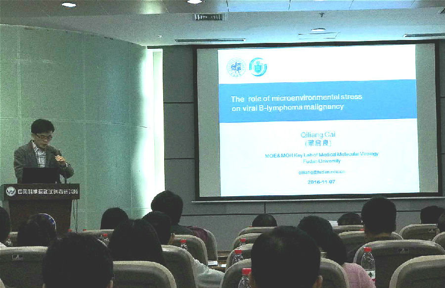 2016年11月6日至7日,第四届疱疹病毒与相关疾病及抗病毒策略国际研讨会在中国科学院武汉病毒所召开,本课题组PI蔡启良研究员参加该次会议,并汇报本课题组关于“肿瘤微环境应激对B淋巴瘤恶化作用”的最新研究进展,获得与会者的一致好评。