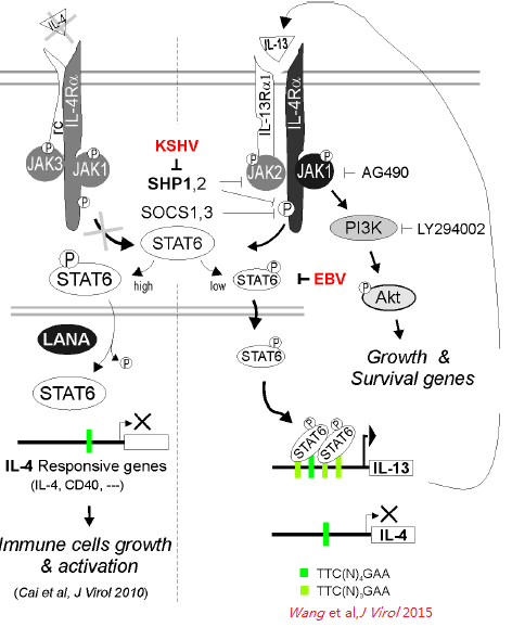 KSHV篡改免疫信号通路促进感染机制新发现 近期本实验室博士生王冲、朱彩霞等人研究发现,KSHV感染诱导的卡波氏肉瘤组织中存在着一定水平被持续激活的STAT6,深入研究发现STAT6持续激活的机制是由于KSHV病毒感染下调STAT6激活抑制蛋白SHP1表达,并上调细胞因子IL-13高水平分泌所引起。同时也发现EB病毒共感染可抑制了KSHV诱发STAT6持续激活。从而首次揭示了KSHV单独感染和KSHV/EBV共感染诱发淋巴瘤生成的潜在差异,以及STAT6作为相应淋巴瘤诊治靶向的可能性。该结果发表在最近Journal of Virology上。 Wang C, Zhu C, Wei F, Zhang L, Mo X, Feng Y, Xu J, Yuan Z, Robertson ES, Cai Q*, Constitutive activation of IL-13/STAT6 contributes to KSHV-associated PEL cell proliferation and survival. Journal of Virology, 2015 Aug 5. pii: JVI.01525-15. [Epub ahead of print]