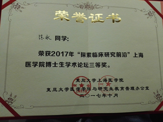 2017年10月20日,复旦大学上海医学院举办“探索临床研究前沿”博士生学术论坛,我课题组博士研究生陈永医生进行现场汇报,并获三等奖。
