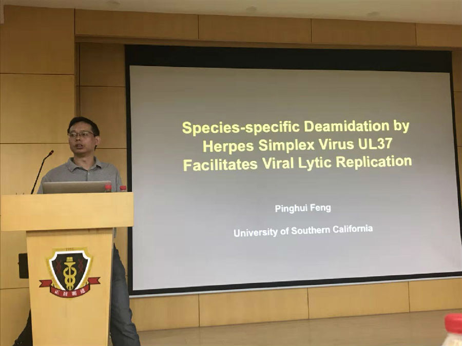 南加州大学冯平辉教授应邀来我系作报告 2018年9月24日上午,美国南加州大学冯平辉教授应本课题组蔡启良研究员邀请,为基础医学院师生作了主题为Protein Deamidation in Herpesvirus Immune Evasion of RIG-I and cGAS 以及Exploring Herpesvirus infection to probe Roles of Protein Deamidation的精彩学术讲座。