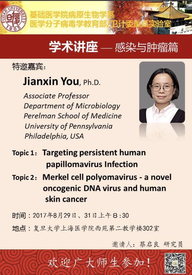 2017年8月28日、31日,Pennsylvania 副教授 Jianxin You 应邀参与本课题组蔡启良研究员开办的fist课程:传染肿瘤学 授课。